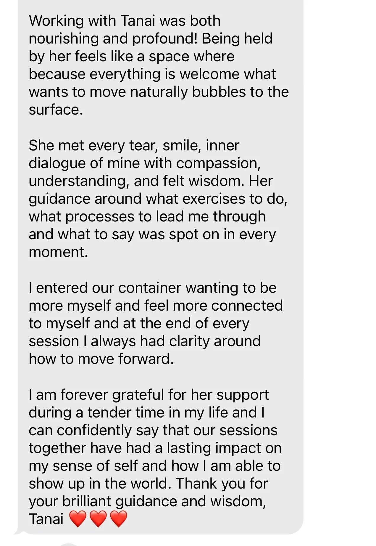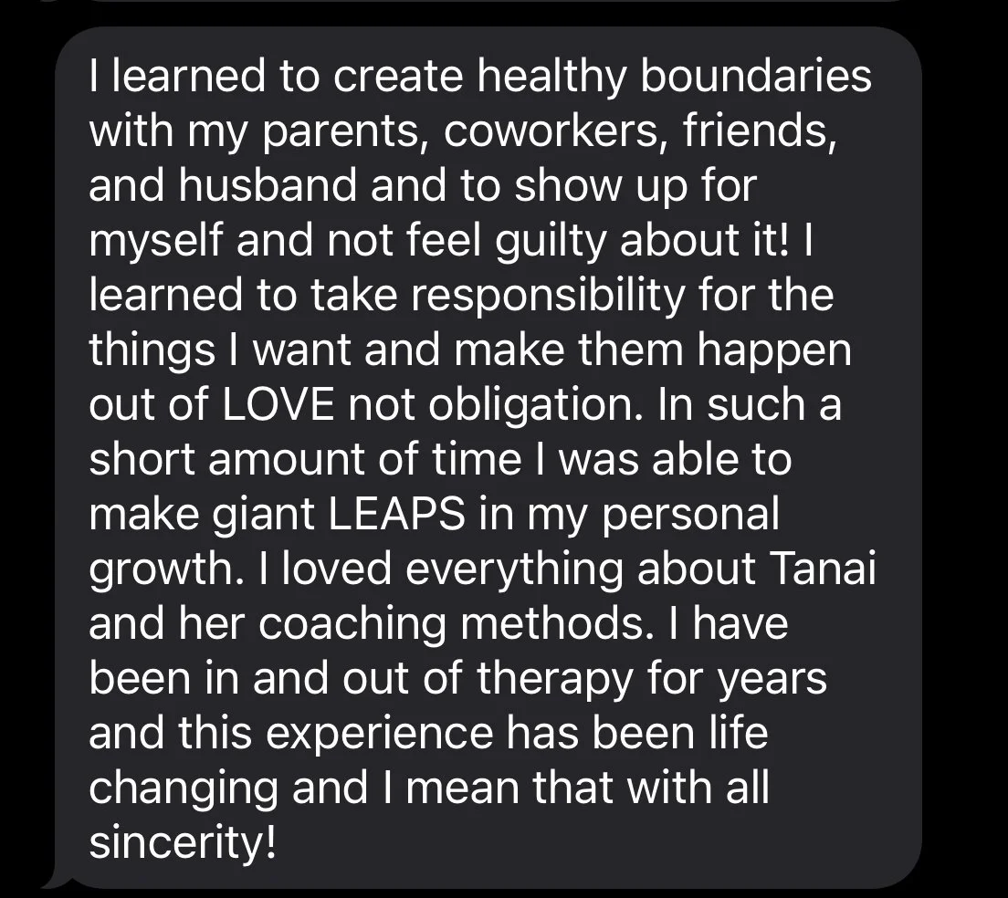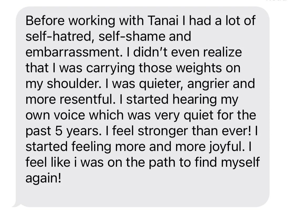 “Tanai has the vibe of an approachable friend, sitting across the table, ready to throw down the truth bombs you’ve either been avoiding or haven’t considered yet. If you are ready to do the work, Tanai is there with a flashlight. A flashlight that she is going to use to point out what needs to be heard and then she’ll put it on the table for YOU to take hold of and use while you continue to learn, heal, and grow. After our conversations, reflection of piercing questions and utilization of the tools, I am unapologetically and unabashedly thriving.