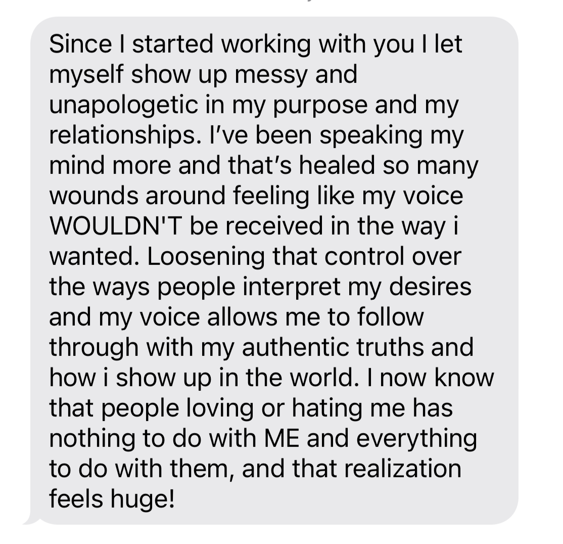 I’ve been working with 100+ women for the past 6 years helping them stop people pleasing, heal from childhood trauma and embrace their fears to create lives where they feel free to love themselves and be fully self-expressed.